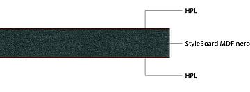 - StyleBoard MDF noir : Panneau de fibres de densité moyenne (MDF) teinté dans la masse en noir de manière décorative, avec une structure homogène.