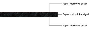 - Stratifié compact noir : Âme en stratifié compact, massive, homogène et teintée en noir, antichoc et résistant à l’humidité pour les applications à fortes charges.