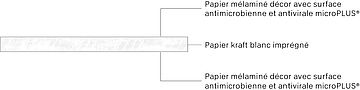 - La surface décorative et l’âme du matériau constituée de couches de papier imprégnées de résines thermodurcissables. Les résines durcissent complètement pendant le processus de fabrication, sous l'effet de la chaleur et de la pression élevée. Elles forment un matériau stable, résistant et non réactivable.