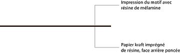 - La surface décorative et l’âme du matériau constituée de couches de papier imprégnées de résines thermodurcissables. Les résines durcissent complètement pendant le processus de fabrication, sous l'effet de la chaleur et de la pression élevée. Elles forment un matériau stable, résistant et non réactivable.
