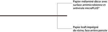 - La surface décorative et l’âme du matériau constituée de couches de papier imprégnées de résines thermodurcissables. Les résines durcissent complètement pendant le processus de fabrication, sous l'effet de la chaleur et de la pression élevée. Elles forment un matériau stable, résistant et non réactivable.