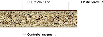 - La surface décorative et l’âme du matériau constituée de couches de papier imprégnées de résines thermodurcissables. Les résines durcissent complètement pendant le processus de fabrication, sous l'effet de la chaleur et de la pression élevée. Elles forment un matériau stable, résistant et non réactivable.