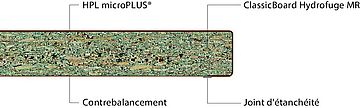 - La surface décorative et l’âme du matériau constituée de couches de papier imprégnées de résines thermodurcissables. Les résines durcissent complètement pendant le processus de fabrication, sous l'effet de la chaleur et de la pression élevée. Elles forment un matériau stable, résistant et non réactivable.