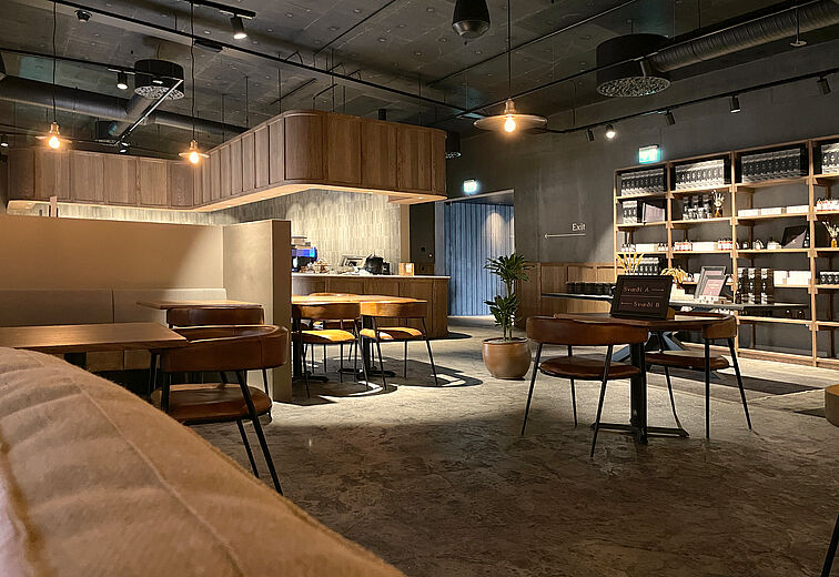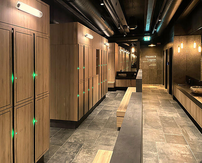 Afin de poursuivre ce concept global à l'intérieur tout en répondant aux exigences modernes en matière de confort, de durabilité, de résistance et de facilité de nettoyage, le choix des matériaux et les décisions relatives aux matériaux utilisés pour le mobilier et l'aménagement intérieur ont été sélectionnés et poursuivis avec la même détermination. Une attention particulière a été accordée aux vestiaires et aux douches, car ce sont les zones les plus importantes entre les étapes individuelles du rituel du bain et, à la fin de celui-ci, l'interface avec la circulation publique.