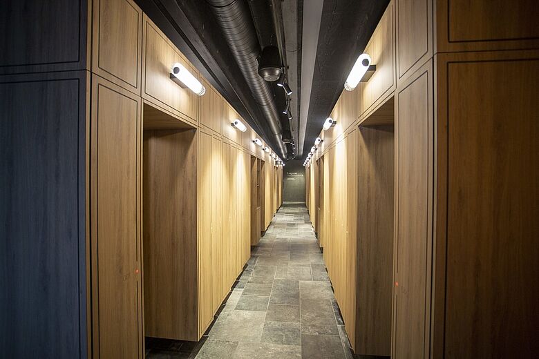 La décision a été prise d'utiliser le Duropal HPL Compact pour les salles de réunion et les vestiaires VIP. Le stratifié compact peut être utilisé sans matériau de support supplémentaire et répond à toutes les exigences de ce domaine d'application difficile. Le HPL Compact est résistant à l'humidité et à faible gonflement, tout en étant particulièrement résistant aux chocs et facile à nettoyer. En outre, la surface est antimicrobienne et a une influence positive sur le climat de la pièce - Duropal HPL Compact est particulièrement peu polluant et a reçu l'Ange Bleu, RAL UZ 76.
