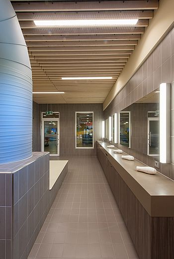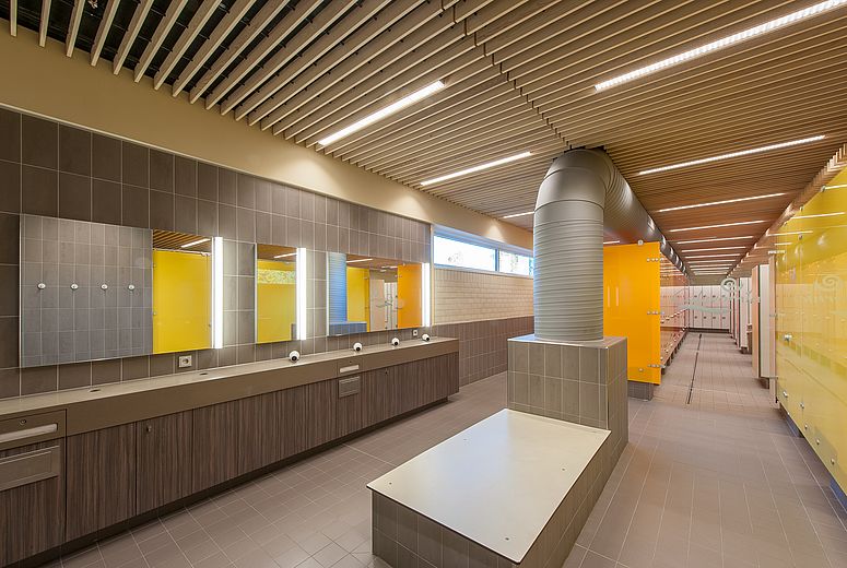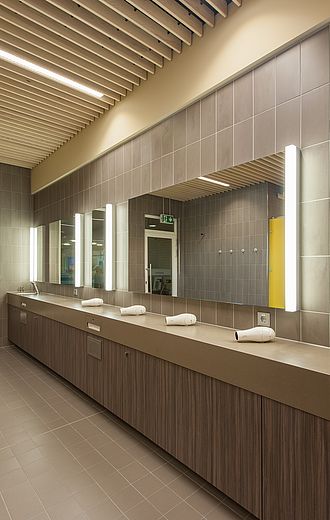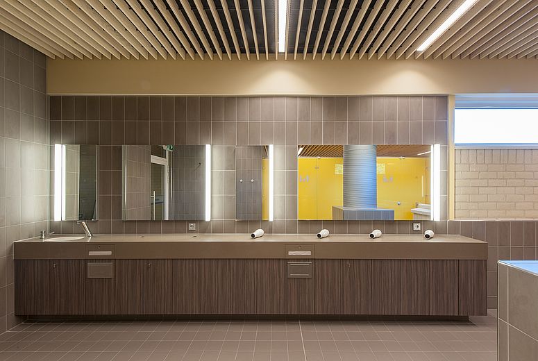 The aim of the commissioned Foest Architecture office was to modernise the heavily used premises on the basis of current regulations and technical requirements, both structurally and constructively, in such a way that they continue to attract vistors to the swimming pool. For reasons of hygiene, the 400 square metre changing area was completely gutted. This opportunity offered the opportunity to optimise the room structures and to make the walk-through areas more goal-oriented. The integration of the hairdryer and make-up table into the changing room, for example, brought increased revenue at the checkout and waiting areas. With the reduction in the number of individual changing rooms in favour of collective and family changing areas, the range of products on offer for groups has increased.