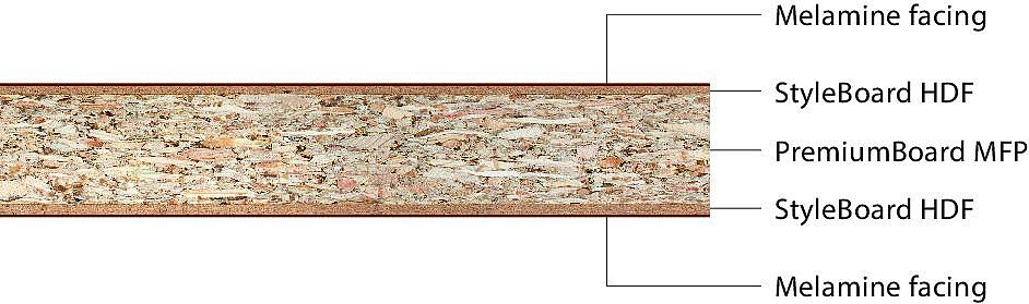 - PremiumBoard MFP Hybrid: PremiumBoard MFP Hybrid consists of a PremiumBoard MFP as core layer combined with StyleBoard HDF as top layers with a thickness of 2 mm that can also be laminated on both sides. The MFP and HDF panels are glued using PVAC-glue (D4-glue). Due to its isotropic bending strength, its very good screw-holding strength and its high durability, the Hybrid wood-based panel is mainly suited for applications where high stability and load-bearing capacity are required.
