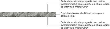 - La superficie decorativa e l'anima si compongono di piú strati di carta impregnate di resine termoindurenti; queste resine si fondono completamente durante il processo di fabbricazione che sotto l'effetto del calore e dell'elevata pressione si da origine ad un materiale stabile, resistente e irreversibile.