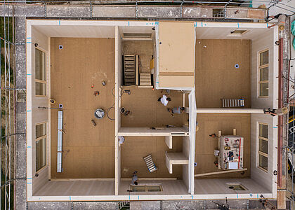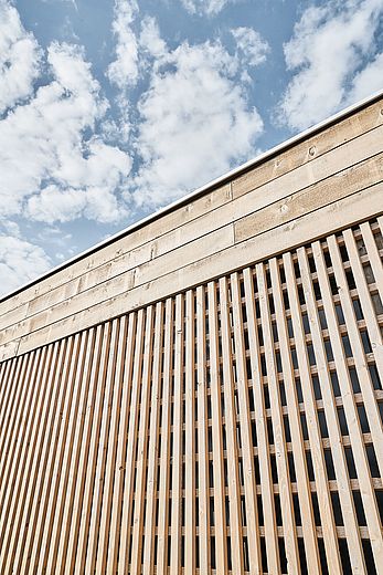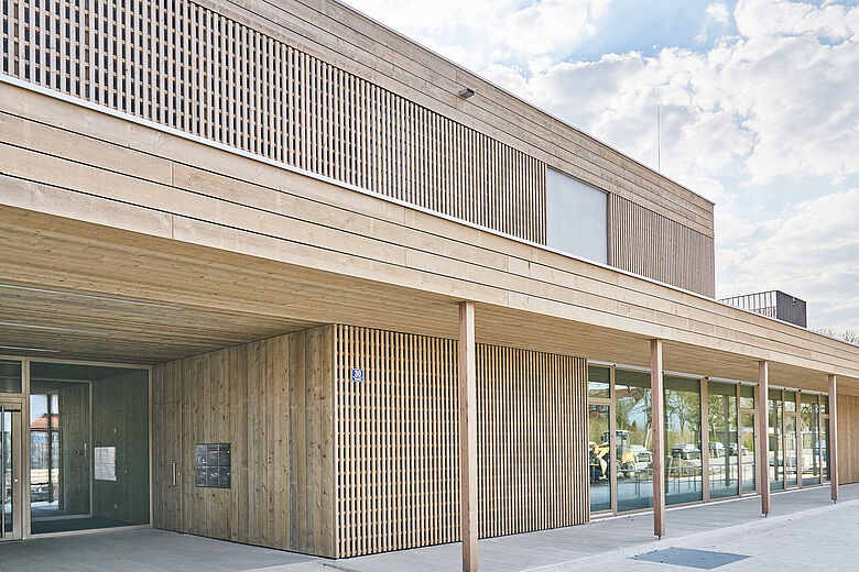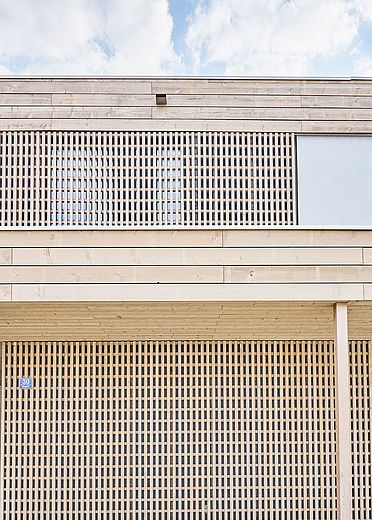 Le pareti dell'intero edificio sono state progettate ed eseguite con una struttura a telaio in legno. Ciò ha permesso, tra l'altro, di integrare l'isolamento delle pareti esterne direttamente nelle strutture murarie e di applicare in modo coerente il linguaggio progettuale snello e ridotto dell'edificio. Con LivingBoard face contiprotect P5 è stato utilizzato un prodotto Pfleiderer per la costruzione dei pannelli di irrigidimento degli elementi delle pareti interne, che risponde perfettamente ai requisiti del progetto e supporta anche i requisiti statici dell'edificio. Il pannello, premiato con l'Angelo Blu e incollato senza formaldeide, si caratterizza non solo per l'eccellente salubrità in condizioni di vita, ma anche per il buon rapporto qualità-prezzo e la facilità di lavorazione. La versione resistente all'umidità di LivingBoard face contiprotect P5 protegge in modo affidabile la costruzione dagli effetti degli agenti atmosferici durante la fase di costruzione.