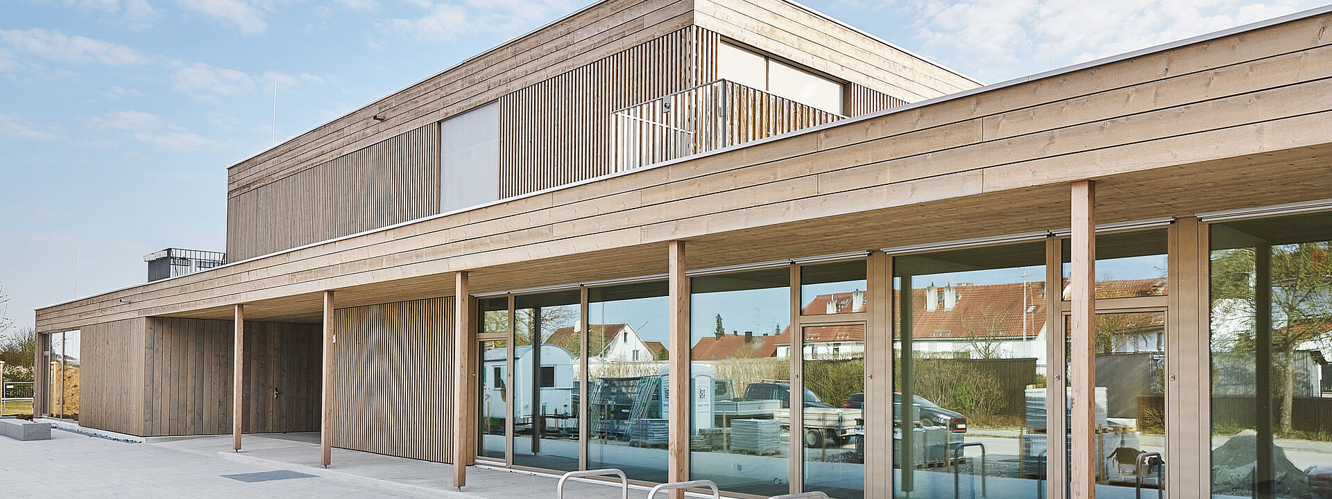 Nel 2015, il comune di Kirchheim ha indetto una gara d'appalto per la costruzione di una nuova casa in legno per bambini con asilo, nido, doposcuola e cinque appartamenti. Il concorso è stato vinto dallo studio Spreen Architekten di Monaco. Il progetto ha convinto per la sua struttura coerente, in cui le sale per i gruppi e le sale ausiliarie sono disposte a isole come mulini a vento intorno a un foyer centrale e a una sala polivalente. Particolare attenzione è stata rivolta all'interconnessione tra interno ed esterno. In questo modo, ogni gruppo dispone di spazi aperti direttamente assegnati e di un collegamento con l'area esterna comune. Oltre alla desiderata formazione a isola dei singoli gruppi, ciò ha l'effetto che tutte le stanze del gruppo ricevono luce naturale da due direzioni. I cinque appartamenti sono stati collocati al primo piano. In questo modo è stato possibile disaccoppiare il più possibile le aree funzionali nonostante la loro vicinanza spaziale.