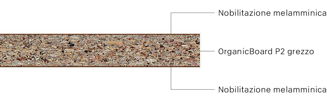 - OrganicBoard P2 grezzo: Pannello truciolare incollato in maniera proporzionata con colla biogenica priva di formaldeide (OrganicGlue) e con un contenuto di legno riciclato di circa il 50 % di tipo P2 secondo la norma EN 312. Adatto per utilizzi non portanti in aree asciutte.