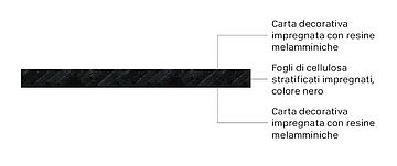 - La superficie decorativa e l'anima si compongono di piú strati di carta impregnate di resine termoindurenti; queste resine si fondono completamente durante il processo di fabbricazione che sotto l'effetto del calore e dell'elevata pressione si da origine ad un materiale stabile, resistente e irreversibile.