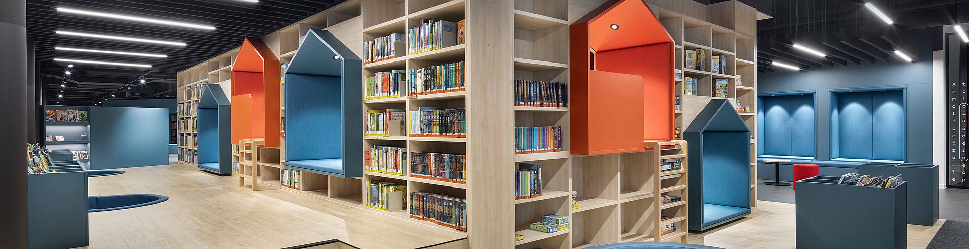 Frank Dittel: Il design dinamico della sala che ne è scaturito comprende varie nicchie con separazione acustica per la lettura e il lavoro concentrati, nonché un'area per il multimediale, con supporti AV, CD e docking station con cuffie. Vi è anche uno studio per la musica e i podcast, oltre a uffici e sale per gruppi. I visitatori più giovani hanno accesso a un'area per bambini di 340 m² con nicchie di lettura e gioco simili ad alberi integrate nella parete di libri. Queste sono visibili nella parete di fondo della scultura delle scale mentre si sale. Per gli adulti, una spaziosa sala di lettura con carattere lounge offre 220 m² di spazio per un massimo di 100 persone e può essere utilizzata per eventi indipendentemente dalla biblioteca, in quanto ha un accesso separato al bar e ai servizi igienici.