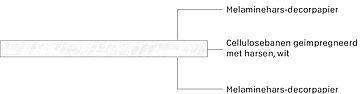 - De decoratieve oppervlakken en de materiaalkern bestaan uit papierlagen, die met duroplastische harsen doordrenkt zijn.Deze harden tijdens het productieproces door hitte en hoge druk geheel uit. Ze bouwen een stabiele, resistente en niet reactief materiaal.