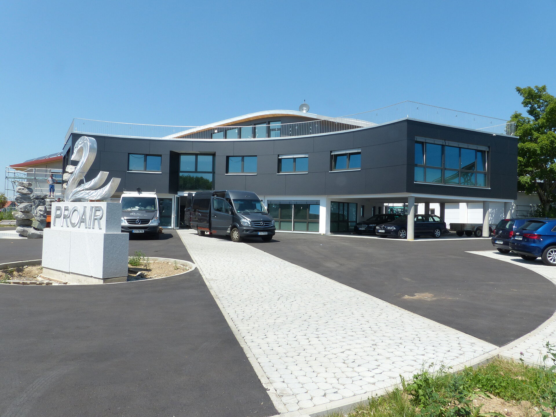 Dieter Herz: Bij ProAir was het duidelijk dat het administratiegebouw ook een beetje een "gebouwde bedrijfsfilosofie" moest zijn. Onze architect Anita Bechter creëerde daarom een ontwerp dat is afgeleid van de technologie van de ProAir-producten. Gebaseerd op de woorden van de klant "Alles draait hier", borduurt het kwartcirkelvormige gebouw voort op het concept van de roterende, zogenaamde kliklamel. Dit is het gepatenteerde middelpunt van het hoofdproduct van ProAir en geeft het zijn technologische uniciteit. Het resulterende gebouw is harmonieus en rond, wat ook voordelen biedt voor de interne organisatie: Korte afstanden, grote kantoren, duidelijke functionele gebieden en een prachtig uitzicht op de omgeving. De uitgang op het dak volgt ook de vloeiende designtaal; deze is afgeleid van het logo van het bedrijf. Het ontwerp heeft vanaf het begin indruk gemaakt op de klant.