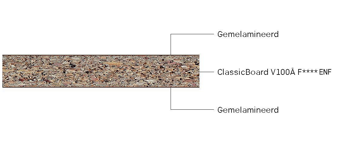 - ClassicBoard V100 Ä F**** ENF: Door ureumhars gebonden meubelpanelen met zeer lage emissiewaarden en verminderde diktezwelling zoals omschreven in EN 312, geschikt voor niet-dragende doeleinden in een vochtige omgeving.