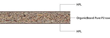 - OrganicBoard Pure P2 ruw: Spaanplaat verlijmd met 100% biogene, formaldehydevrije lijm (OrganicGlue) met een gehalte gerecycled hout van 100% type P2 volgens EN 312, geschikt voor niet-dragende toepassingen in droge ruimtes.