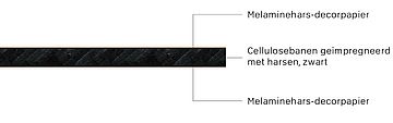 - De decoratieve oppervlakken en de materiaalkern bestaan uit papierlagen, die met duroplastische harsen doordrenkt zijn.Deze harden tijdens het productieproces door hitte en hoge druk geheel uit. Ze bouwen een stabiele, resistente en niet reactief materiaal.