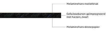 - De decoratieve oppervlakken en de materiaalkern bestaan uit papierlagen, die met duroplastische harsen doordrenkt zijn.Deze harden tijdens het productieproces door hitte en hoge druk geheel uit. Ze bouwen een stabiele, resistente en niet reactief materiaal.