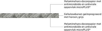 - De decoratieve oppervlakken en de materiaalkern bestaan uit papierlagen, die met duroplastische harsen doordrenkt zijn.Deze harden tijdens het productieproces door hitte en hoge druk geheel uit. Ze bouwen een stabiele, resistente en niet reactief materiaal.