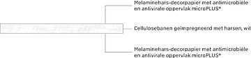 • De decoratieve oppervlakken en de materiaalkern bestaan uit papierlagen, die met duroplastische harsen doordrenkt zijn.Deze harden tijdens het productieproces door hitte en hoge druk geheel uit. Ze bouwen een stabiele, resistente en niet reactief materiaal.