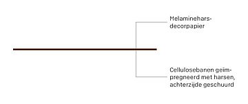 - De decoratieve oppervlakken en de materiaalkern bestaan uit papierlagen, die met duroplastische harsen doordrenkt zijn.Deze harden tijdens het productieproces door hitte en hoge druk geheel uit. Ze bouwen een stabiele, resistente en niet reactief materiaal.