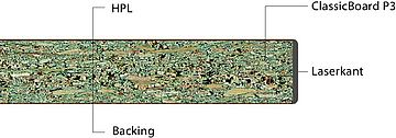 - De decoratieve oppervlakken en de materiaalkern bestaan uit papierlagen, die met duroplastische harsen doordrenkt zijn.Deze harden tijdens het productieproces door hitte en hoge druk geheel uit. Ze bouwen een stabiele, resistente en niet reactief materiaal.