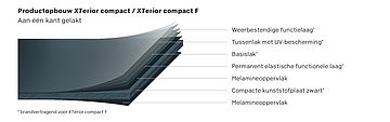 - Duropal XTerior compact voldoet aan de hoogste eisen met betrekking tot UV-bestendigheid van het oppervlak en is door zijn hoge mechanische sterkte en ontwerpvrijheid ideaal voor buitentoepassingen zoals gevels, tuinmeubilair, privacyschermen, daken, balkons of speeltoestellen. Vooral geschikt wanneer er hoge eisen worden gesteld aan robuustheid, weerbestendigheid en eenvoudige reiniging.