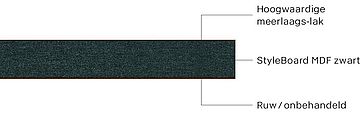 - StyleBoard MDF zwart: Decoratieve, door-en-door gekleurde zwarte vezelplaat van gemiddelde dichtheid (MDF), met een homogene opbouw.