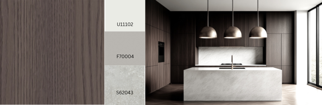 Verticale strepen in hout, metaal en textiel benadrukken de rust en lineariteit van materialen. In het textieldecor Kosai benadrukt de sterkere schering ten opzichte van de inslag de verticale structuur. Het decor oogt driedimensionaal en natuurlijk, vooral in combinatie met de Crocket-textuur en de diepe Allegro-textuur(Deep Flow). Kosai voegt een gezellige toets toe in combinatie met veel houtsoorten, effen kleuren en stenen. De donkere, warme lavakleur is universeel compatibel. Een andere variant is F76202 Kosai Grey.