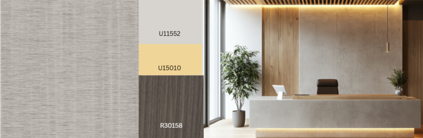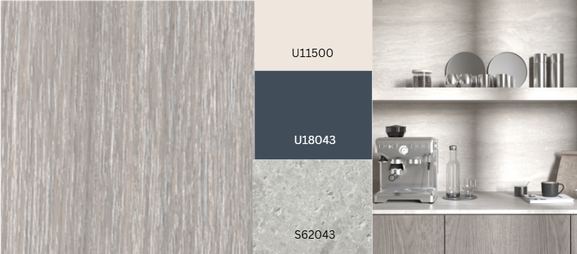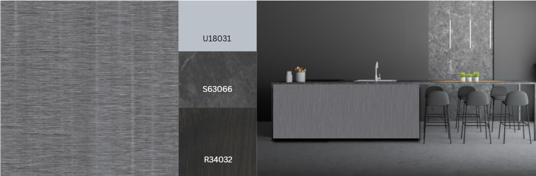 Verticale strepen in hout, metaal en zelfs textiel benadrukken de rust en lineariteit van materialen. In het textieldecor Kosai benadrukt de sterkere kettingdraad in vergelijking met de inslagdraad de verticale structuur. Het decor oogt driedimensionaal en natuurlijk, vooral in combinatie met de Crocket-textuur en de diepe Allegro-textuur(Deep Flow). Kosai voegt een gezellige toets toe in combinatie met veel houtsoorten, effen kleuren en stenen. De lichte, warme grijstint is universeel compatibel. Een andere variant is F76203 Kosai Lava.