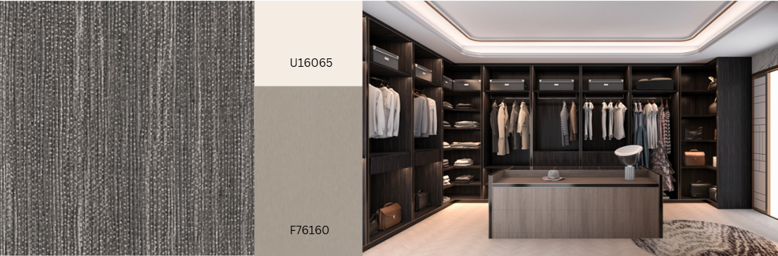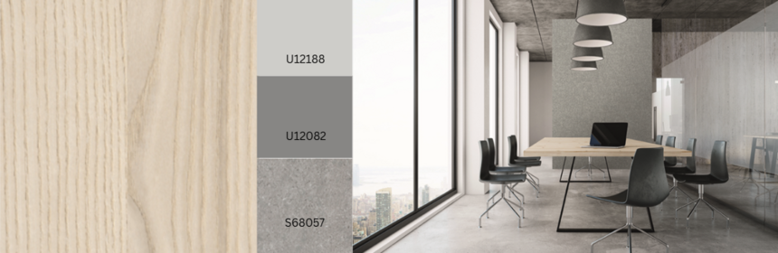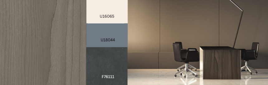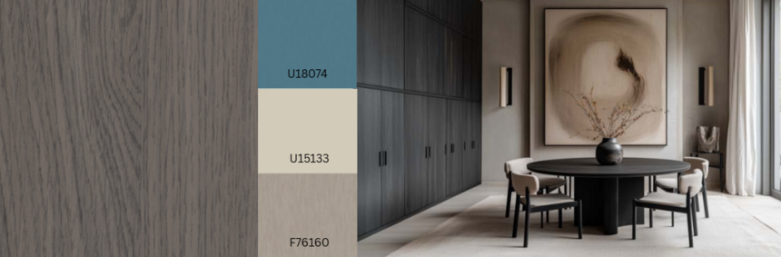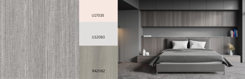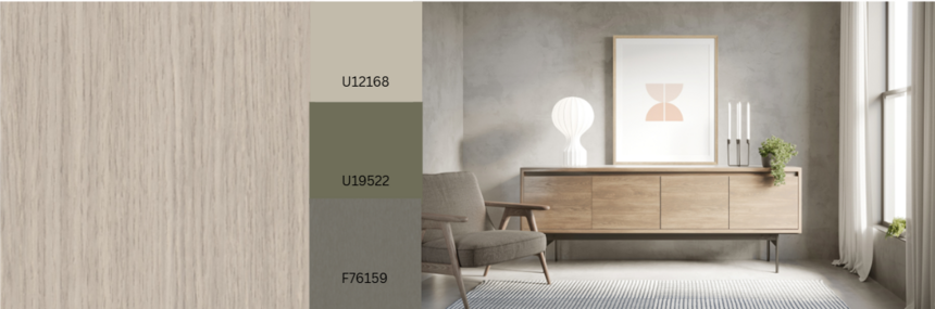 Grijsachtig tot beige houtsoorten zijn ideaal voor ton-sur-ton combinaties met neutrale effen kleuren en materialen. Edison Greige vult dit aan met zijn subtiele, over het hele oppervlak gestreepte nerf; de terugkerende donkere delen worden versterkt door de matte, scherpe Natural Wood-textuur, die het hout tot leven brengt en het een zeer natuurlijke uitstraling geeft. Een andere variant: R20541 Edison Taupe.