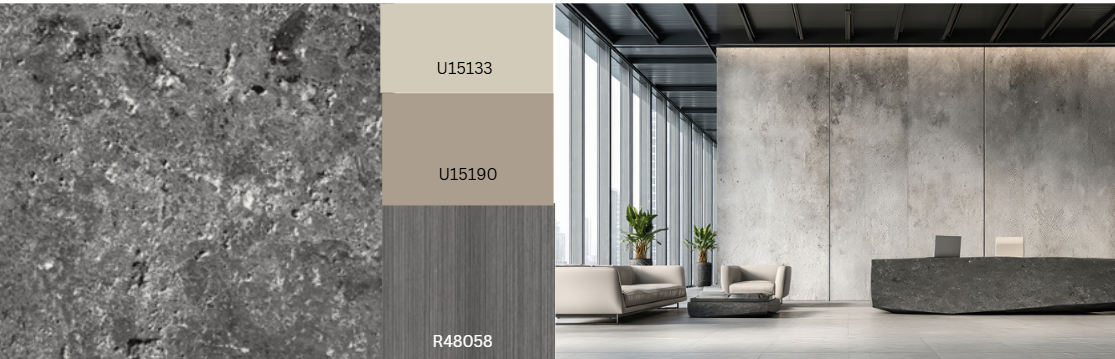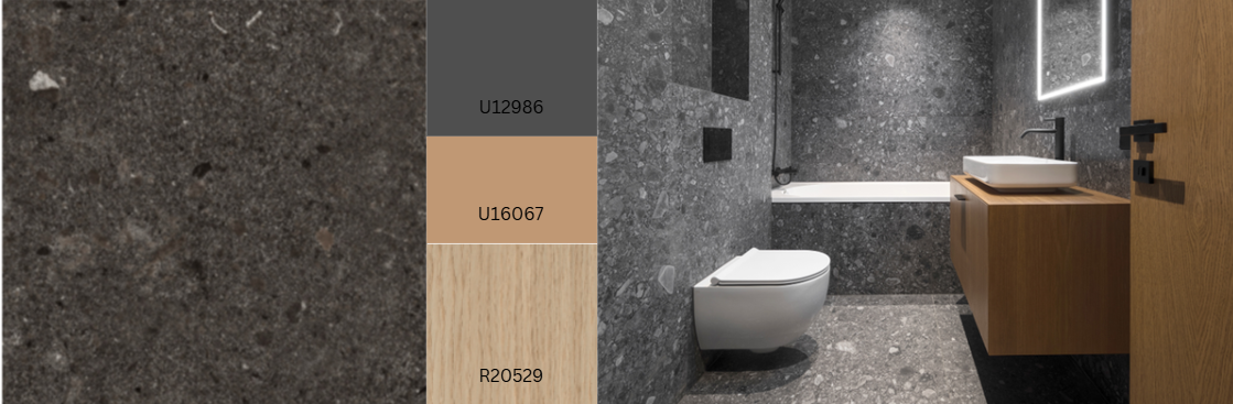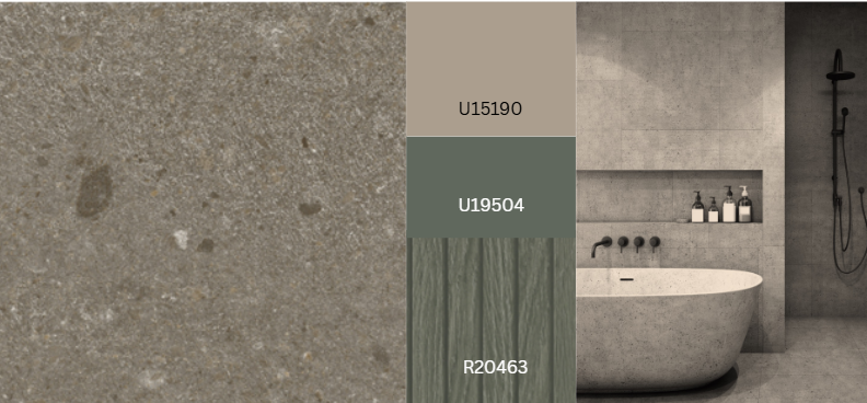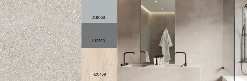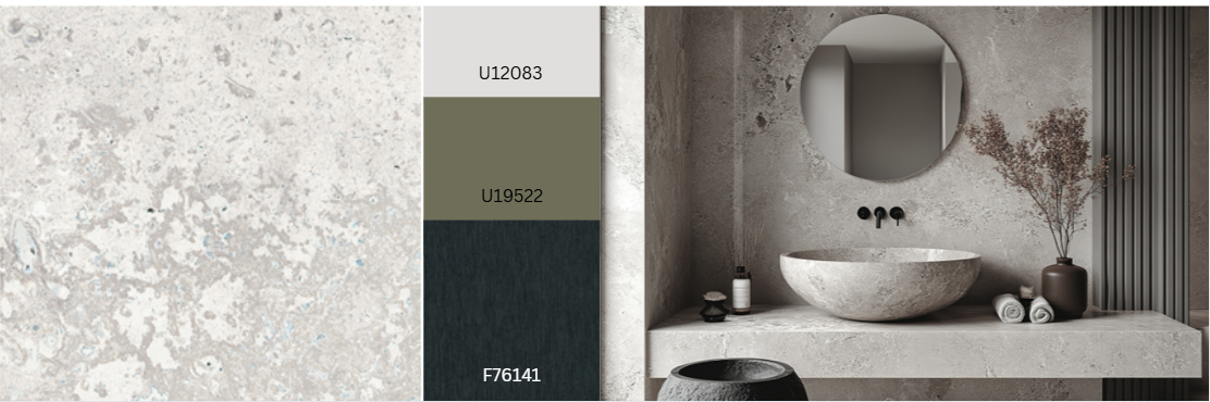 The bold and eye-catching stone design Tetra can look like different materials. With the Ceramo texture, it feels like ceramic. With Corrosio, it looks like metal. With Sandpearl, it feels like sandstone. The rough-looking surface has warm greige to ochre tones, and the bright, softshaped craters stand out with strong contrast. This gives Tetra a very 3D look, making it great for large surfaces.