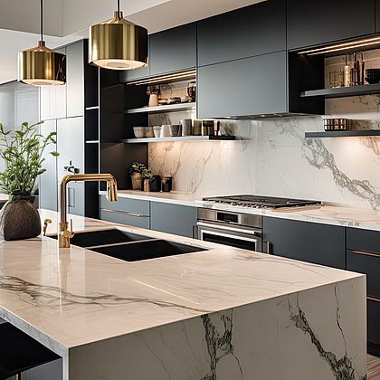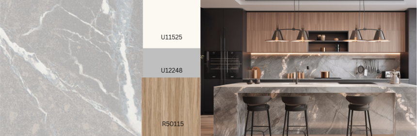 Marquina is een opvallende marmersoort. Het sterke contrast van zachte witte aders op een neutrale grijze ondergrond wordt verzacht door een subtiel taupe wolkeneffect. Hoewel het op het eerste gezicht vrijwel monochroom lijkt, maakt dit het gemakkelijk te combineren met vrijwel elke houttint. Het is geschikt voor zowel fronten als horizontale oppervlakken. Een andere kleurvariant: S63081 Marquina.