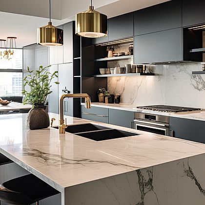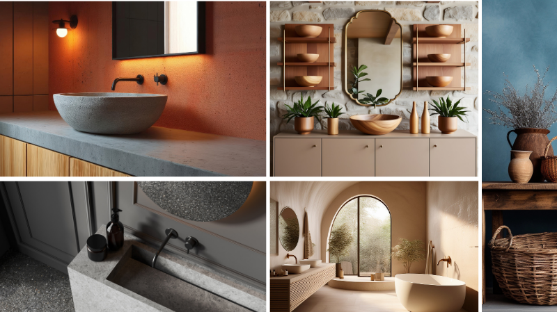 - Werkbladen in zandsteen, terrazzo of marmer. Accessoires: warme matte metalen, vlechtwerk en rotan.