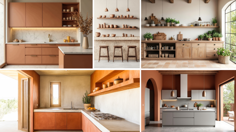 - Fronten van levendig hout in warme natuurlijke tinten; geborsteld hout in greige; rotan en vlechtwerk.