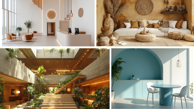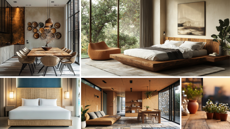- Meubels en wandpanelen van levendig hout in warme natuurlijke tinten; geborsteld hout in greige; rotan en riet.