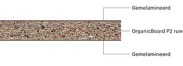 - OrganicBoard P2 ruw: Spaanplaat proportioneel verlijmd met biogene, formaldehydevrije lijm (OrganicGlue) met een gehalte gerecycled hout van ca. 50 % type P2 volgens EN 312, geschikt voor niet-dragende toepassingen in droge ruimtes.
