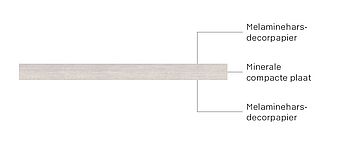 - Het decoratieve oppervlak bestaat uit papierlagen en een minerale materiaalkern, die met duroplastische harsen doordrenkt zijn. Deze harden tijdens het productieproces door hitte en hoge druk geheel uit. Ze bouwen een stabiele, resistente en niet reactief materiaal.