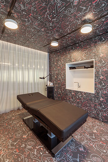 De architecten voeren hun ideeënrijkdom consequent door in de vormgeving van de afzonderlijke ruimtes; met een zeer gedetailleerd oppervlaktedesign, dat dankzij individuele decors in deze vorm zeker uniek te noemen is. De ruimte moet levendig ogen, voor de waarnemer vanuit ieder perspectief anders overkomen – bij het flaneren, bij het betreden van de beautyloft, bij het wachten, tijdens de behandeling. Tegelijkertijd dient men aan iedere ruimte af te kunnen zien tot welke beautydiscipline ze behoort. Om dit aan het basisconcept van de hiërarchieloze ruimte ontleende principe te realiseren, werd de kunstenaar Jonathan Calugi ingeschakeld om eigen decors te ontwerpen in de stijl van poparticoon James Rizzi. In de grafische patronen die zich op grotere oppervlakken tot een geheel verenigen, omwikkelen handen, haren, lippen en lichamen, of in het geval van de tattoostudio, sprekende motieven zoals scheepsankers, kruizen, piratenbaarden en pin-up-girls elkaar. In totaal werden er drie motieven ontwikkeld, rond de ingang van de beautyloft zijn deze alle drie gecombineerd in een vierde patroon.