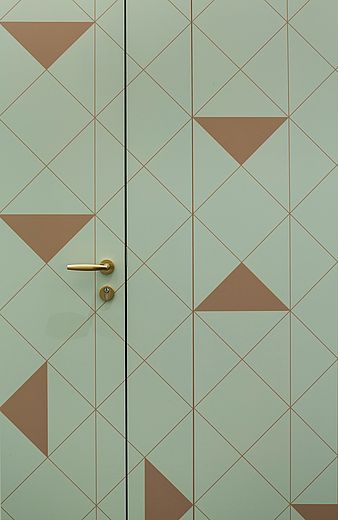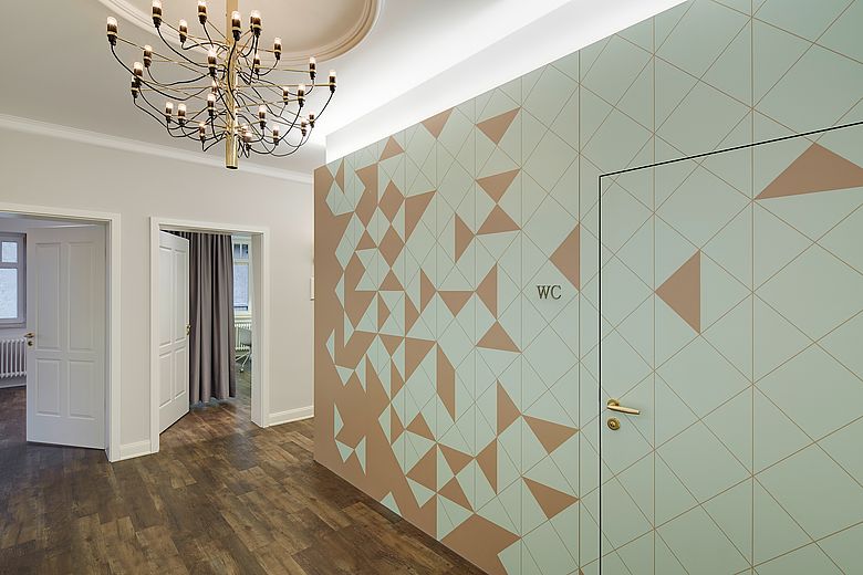 Om de functionele ruimtes aan de andere kant van de onderzoekruimte visueel af te scheiden, koos architect Stefan Roller van Heikaus Interior voor een wandbekleding over de volledige hoogte met een decor van driehoeken in mint en goud, in navolging van het logo van de artsenpraktijk. Dankzij het Individual programma van Pfleiderer was het mogelijk om dit decor als digitale print op de wand aan te brengen. De ruimtebepalende ‘kunst’ onderstreept het bijzondere karakter van deze artsenpraktijk.