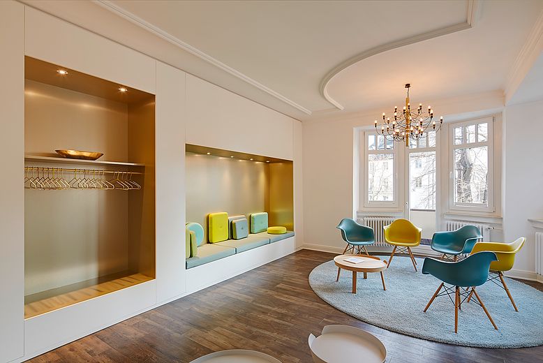 Zowel de voorkant van de witte receptiebalie als de vervangen kamerdeuren zijn vervolgens voorzien van cassettes. Deze terughoudendheid past goed bij de verrassende kleurencombinaties: in de wachtkamer creëert een pastelblauw, hoogpolig, rond tapijt een eiland waarop moderne schaalstoelen in blauw-groene tinten een gezellige zitgroep vormen. Een banknis met bijpassende kussens biedt nog meer mogelijkheden om te gaan zitten. De bekleding van deze nis is uitgevoerd in een goudtint – een gewaagd maar geslaagd contrast dat wordt voortgezet in de open garderobekast ernaast. De gouden kleerhangers en deurklinken en de modern geïnterpreteerde kroonluchter in het midden van de ruimte doen bijna denken aan een theaterdecor.