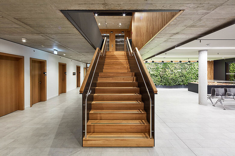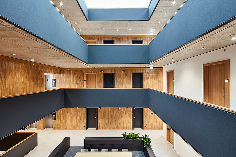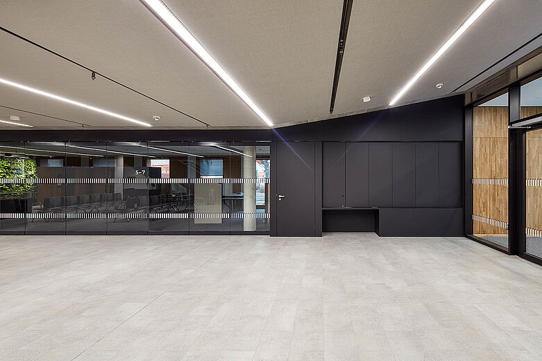 The reduced colour scheme and materiality of the building are designed - in addition to the aesthetic effect - to facilitate orientation in the building in a restrained manner. Wall cladding and doors made of real wood slats as well as smooth floors, parapets and free soffits on the concrete ceilings characterise the image. The use of colour accents is correspondingly sensitive: The Pfleiderer decors vulcanite, anthracite grey and chalk provide subtle accentuation so that doors to functional rooms and sanitary areas are immediately recognisable. The dark decors are also used as part of the interior fittings in the offices and for the reception counter in the foyer of the town hall, in vertical and other less intensively used areas also as PrimeBoard with the same decor and structure.