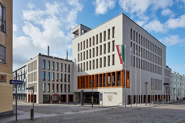 The design by studioinges is based on two building blocks that have grown together: Firstly, a dominant, central main building with a front facing the square. It houses the meeting hall, which has already been identified by the façade design, as well as the citizens' office with foyer. The higher part of the building is framed by an L-shaped element in which the offices of the city administration are located. The internal structure of the design is similarly transparent and well thought-out as the external appearance: it is intended to open up and enliven the public-oriented and representative part of the building - so that the citizens of Bernau see their new town hall as creating an identity and use it without reservation.