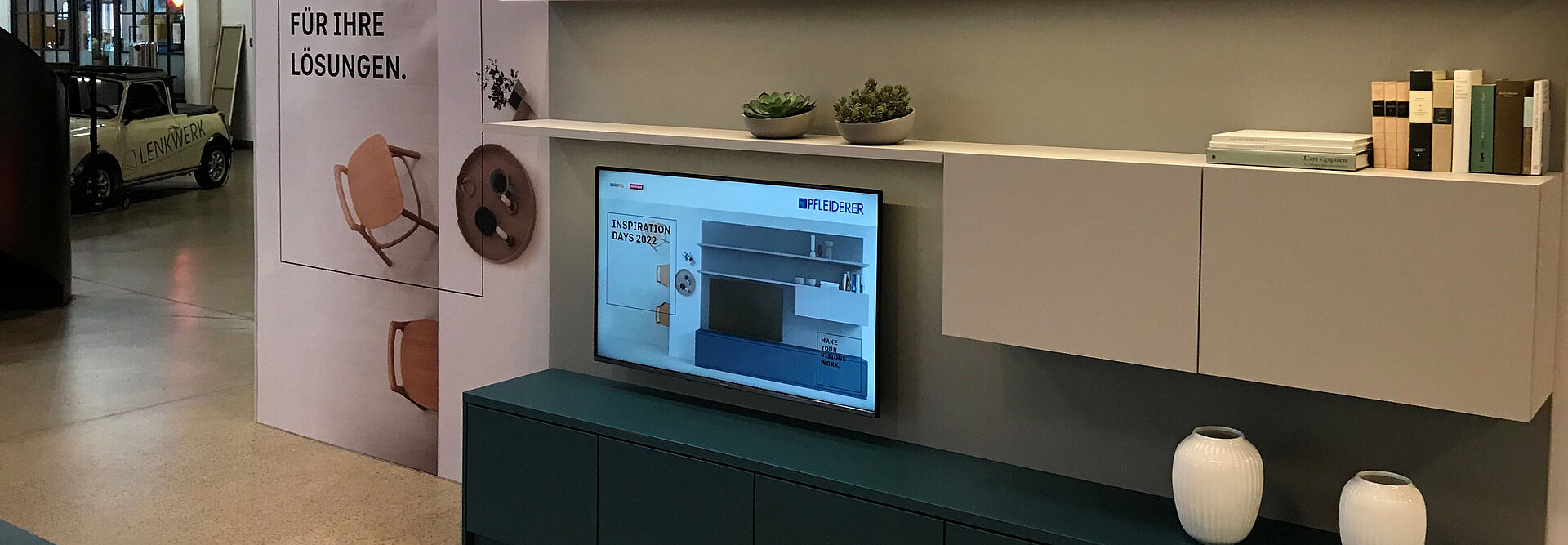 The presentation centres on our latest campaign under the motto of "MAKE YOUR VISIONS WORK"; however, unlike at other times, our partners actually get to meet our trends at the Lenkwerk: the three-dimensionally designed images from the current print and online campaign have been realised here in the form of presentation furniture from real materials, in real dimensions, in realistic room settings.