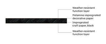 - Compact laminate black: Uniform black through-pigmented solid compact laminate core, impact resistant and moisture resistant for applications with high specification demands.