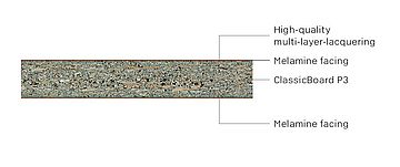 - ClassicBoard P3: Melamine resin bonded particleboard type P3, suitable for non load-bearing purposes in damp areas.