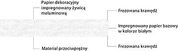 - Powierzchnie dekoracyjne i płyta rdzeniowa składają się z warstw papieru impregnowanych żywicami termoutwardzalnymi. Żywice osiągają pełną twardość w procesie produkcyjnym pod wpływem ciepła i wysokiego ciśnienia. Stają się one stabilnym, odpornym i niewchodzącym w reakcje materiałem.