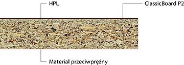 - Powierzchnie dekoracyjne i płyta rdzeniowa składają się z warstw papieru impregnowanych żywicami termoutwardzalnymi. Żywice osiągają pełną twardość w procesie produkcyjnym pod wpływem ciepła i wysokiego ciśnienia. Stają się one stabilnym, odpornym i niewchodzącym w reakcje materiałem.