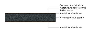 - StyleBoard MDF czarny: Dekoracyjna, czarna, barwiona w masie płyta pilśniowa średniej gęstości (MDF) o jednorodnej strukturze.